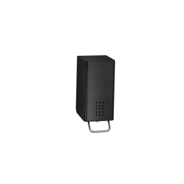 Dispenser for foam soap for wall mounting. stainless steel with PVD coating in anthracite. Cover 1.5mm thickness. Perforated design area with 4mm drillings. Lock not visible. Dispenser lever made out of stainless steel. High quality pump with retraction function. Filling bin with lid. 0.5 litres capacity. 0.7 ml per stroke. The unit can be replaced for cleaning purpose. Including key, stainless steel screws and plugs.