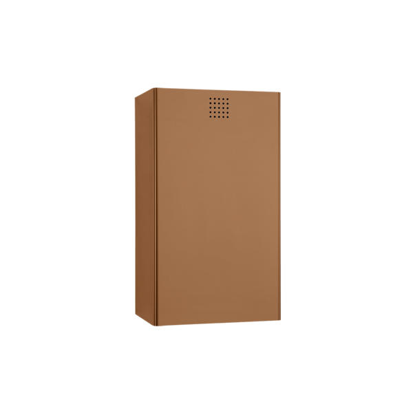 Abfallbehälter für Wandmontage. Edelstahl mit PVD Beschichtung in Kupfer. Front 1,5 mm Materialstärke. Perforierte Gestaltungsfläche mit 4 mm Bohrungen. Integrierte Sackhalterung. Fassungsvermögen ca. 31 Liter. Optional als Standmodell erhältlich. Inkl. Edelstahlschrauben und Dübel.