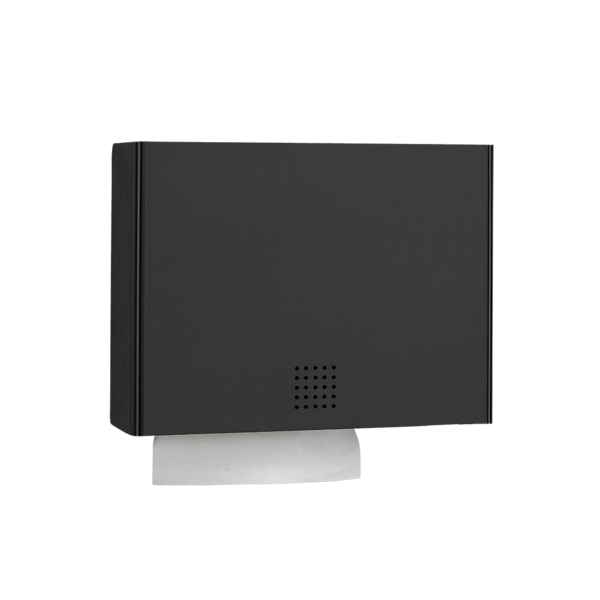 Papierhandtuch- und elektr. Cremeseifenspender Kombination für Wandmontage. Edelstahl, Oberfläche schwarz pulverbeschichtet in RAL 9005 tiefschwarz mit Feinstruktur. Front 1,5 mm Materialstärke. Perforierte Füllstandsanzeige mit 4 mm Bohrungen. Schloss nicht sichtbar. Der Spender ist mit 2 Papierbremsen und ausgeformter Entnahmelippe, für eine sehr einfache Blatt für Blatt Entnahme, ausgeführt. Geeignet für ca. 550 Blatt Papierhandtücher mit einer gefalteten Länge von ca. 220-250 mm und einer gefalteten Breite von ca. 95-120 mm. Elektr. Seifenspender mit Annnäherungsssensor. Spender kann mit Batterien (4x Alkaline 1,5V, Typ AA) betrieben werden oder direkt – mittels optional erhältlichem Netzstecker – an das Netz mit 220 V angeschlossen werden. Seifenbehälter mit Deckel herausnehmbar zum Reinigen. Fassungsvermögen ca. 0,8 Liter. Pro Hub ca. 1,1 ml. Inkl. Schlüssel, Edelstahlschrauben und Dübel.