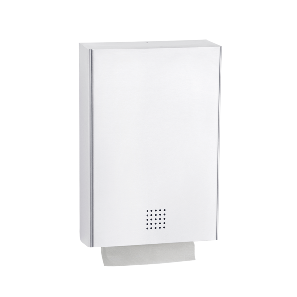 Papierhandtuchspender groß für Wandmontage. Edelstahl, Oberfläche weiß pulverbeschichtet in RAL 9016 verkehrsweiß mit Feinstruktur. Front 1,5 mm Materialstärke. Perforierte Füllstandsanzeige mit 4 mm Bohrungen. Schloss nicht sichtbar. Der Spender ist mit 2 Papierbremsen und ausgeformter Entnahmelippe, für eine sehr einfache Blatt für Blatt Entnahme, ausgeführt. Fassungsvermögen ca. 800 Blatt bei Papierhandtüchern mit ZZ/V-Faltung. Geeignet für Papierhandtücher mit einer gefalteten Länge von ca. 220-250 mm und einer gefalteten Breite von ca. 95-120 mm. Inkl. Schlüssel, Edelstahlschrauben und Dübel.