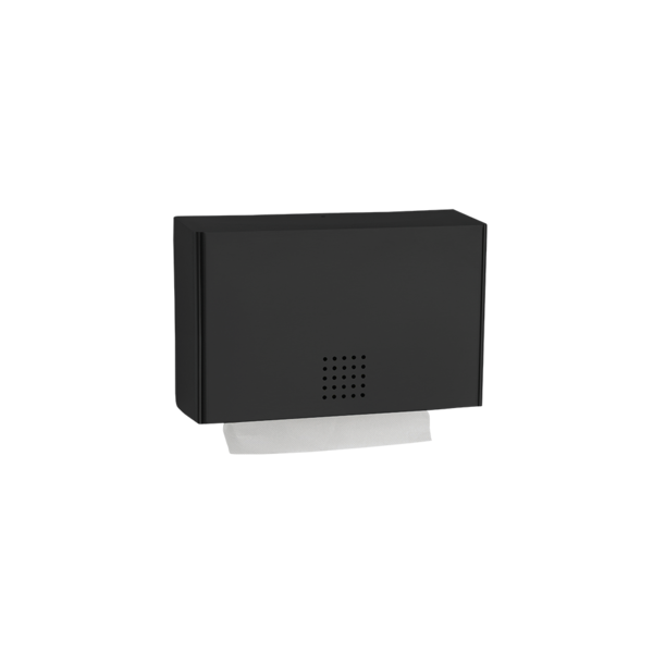 Papierhandtuchspender klein für Wandmontage. Edelstahl, Oberfläche schwarz pulverbeschichtet in RAL 9005 tiefschwarz mit Feinstruktur. Front 1,5 mm Materialstärke. Perforierte Füllstandsanzeige mit 4 mm Bohrungen. Schloss nicht sichtbar. Der Spender ist mit 2 Papierbremsen und ausgeformter Entnahmelippe, für eine sehr einfache Blatt für Blatt Entnahme, ausgeführt. Fassungsvermögen ca. 350 Blatt bei Papierhandtüchern mit ZZ/V-Faltung. Geeignet für Papierhandtücher mit einer gefalteten Länge von ca. 220-250 mm und einer gefalteten Breite von ca. 95-120 mm. Inkl. Schlüssel, Edelstahlschrauben und Dübel.