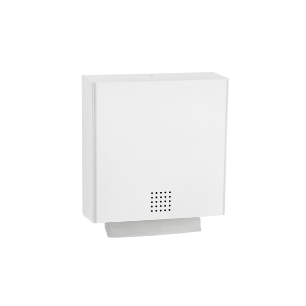 Papierhandtuchspender für Wandmontage. Edelstahl, Oberfläche weiß pulverbeschichtet in RAL 9016 verkehrsweiß mit Feinstruktur. Front 1,5 mm Materialstärke. Perforierte Füllstandsanzeige mit 4 mm Bohrungen. Schloss nicht sichtbar. Der Spender ist mit 2 Papierbremsen und ausgeformter Entnahmelippe, für eine sehr einfache Blatt für Blatt Entnahme, ausgeführt. Fassungsvermögen ca. 550 Blatt bei Papierhandtüchern mit ZZ/V-Faltung. Geeignet für Papierhandtücher mit einer gefalteten Länge von ca. 220-250 mm und einer gefalteten Breite von ca. 95-120 mm. Inkl. Schlüssel, Edelstahlschrauben und Dübel.